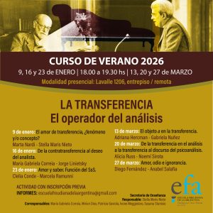 Cursos Curso de Verano 2026: La transferencia. El operador del análisis 9, 16, 23 de enero. 13, 20, 27 de maro. De 18.00 a 19.30 hs.