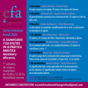 Cursos Curso de Verano 2026: La transferencia. El operador del análisis 9, 16, 23 de enero. 13, 20, 27 de maro. De 18.00 a 19.30 hs. Curso Intensivo Anual: «El significante y sus efectos en la práctica analítica» 1ros sábados de cada mes, de 10.00 a 12.30 hs.