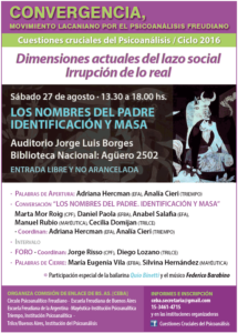 Segundo encuentro del año del Ciclo «Cuestiones Cruciales del Psicoanálisis» convocado por la Comisión de Enlace de Buenos Aires (CEBA) de Convergencia, Movimiento Lacaniano por el Psicoanálisis Freudiano que se realizará en el Auditorio Borges de la Biblioteca Nacional el 27 de agosto de 13.30 a 18.30 hs.