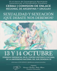 Los días 13 y 14 de octubre se realizaron en la Universidad Nacional de Sur, en Bahía Blanca, las Jornadas de la Comisión de Enlace Regional de Argentina y Uruguay (CERAU) de Convergencia «Sexualidad y sexuación ¿Qué debate nos debemos?. En esta oportunidad presentó un trabajo representando a la EFA Andrés Barbarosch, el mismo puede leerse acá:EL INCONSCIENTE HABLA SEXO