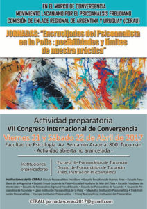 Los días viernes 21 y sábado 22 de abril se realizará la Jornada «Encrucijadas del Psicoanalista en la Polis: posibilidades y límites en nuestra práctica», actividad preparatoria al VII Congreso Internacional, organizada por la Comisión de Enlace de Tucumán (CET: conformada por la Escuela de Psicoanálisis de Tucumán, Grupo de Psicoanálisis de Tucumán y Trieb Institución Psicoanalítica) y convocada por las instituciones que conforman la Comisión de Enlace Regional de Argentina y Uruguay (CERAU).